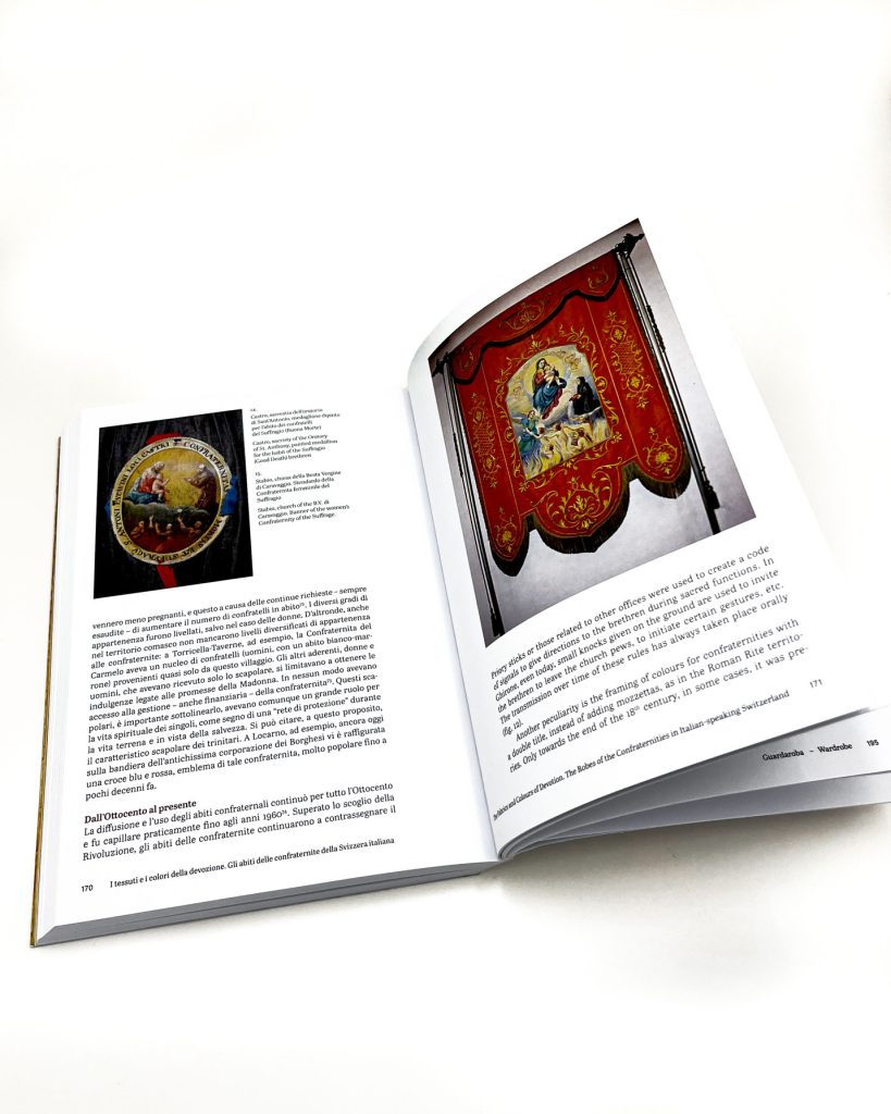 La sezione conclusiva del libro, “Guardaroba”, è dedicata alla galleria fotografica di alcuni degli abiti confraternali esposti nella mostra, appartenenti a diversi contesti storici e geografici. Pur con una sorta di struttura di base condivisa, emerge un’enorme varietà in ogni minimo dettaglio: tessuto, colore, taglio, forma, cintura, fino naturalmente ai simboli, stemmi e accessori.